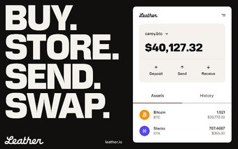 Leather ที่พัฒนาโดย Leather Wallet LLC เป็นกระเป๋าเงิน Bitcoin ที่ใช้เทคโนโลยี Chrome และมอบประสบการณ์ที่ราบรื่นในเศรษฐกิจ Bitcoin ที่กำลังเจริญขึ้น ด้วย Leather ผู้ใช้สามารถจัดการ BTC, Ordinals, Stamps, โทเค็น BRC-20, STX, Stacks NFTs และสินทรัพย์อื่น ๆ ที่มีการรักษาความปลอดภัยด้วย Bitcoin ได้